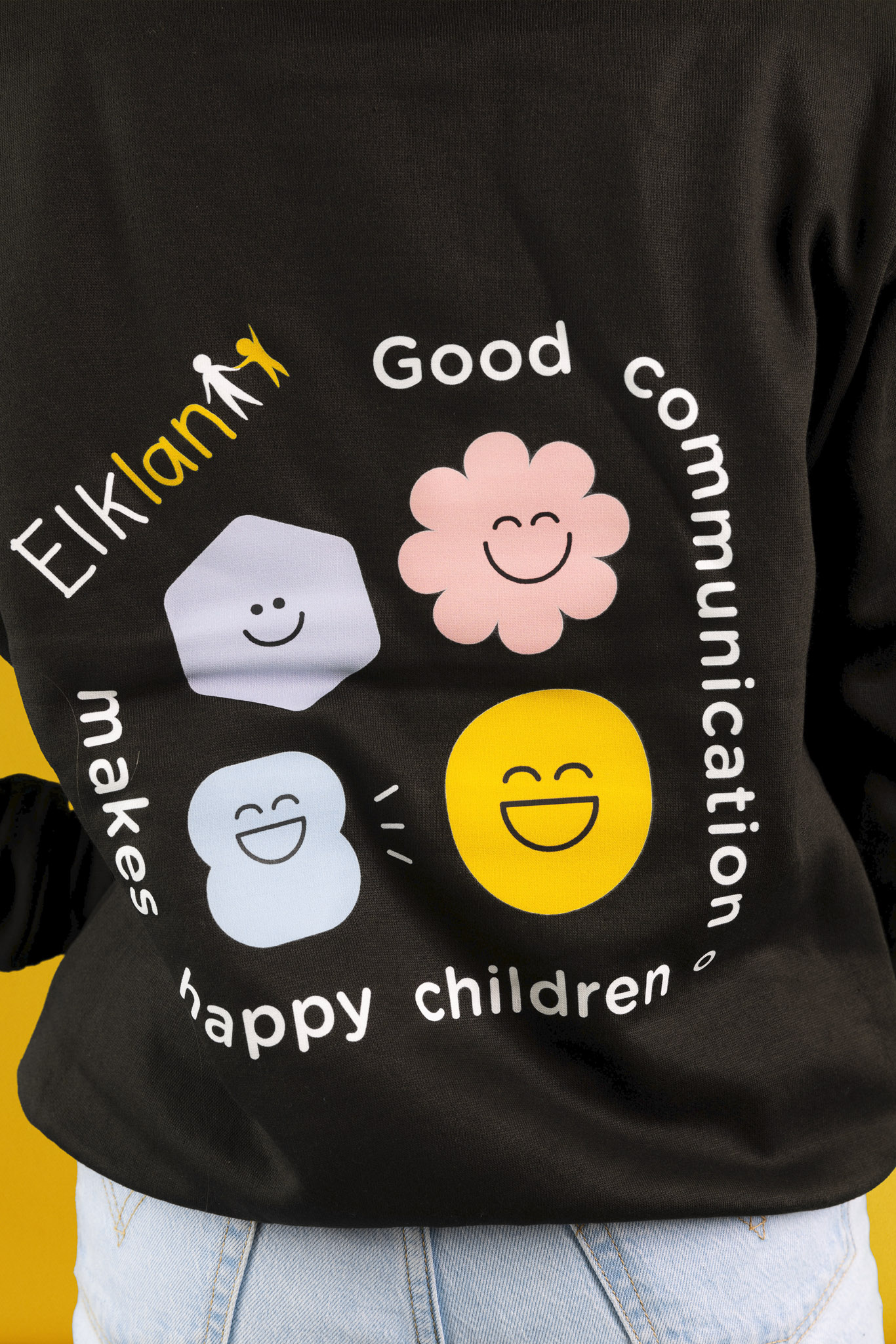A bright and fun black hoodie promoting children’s communication